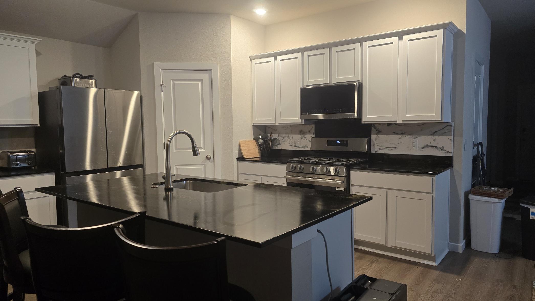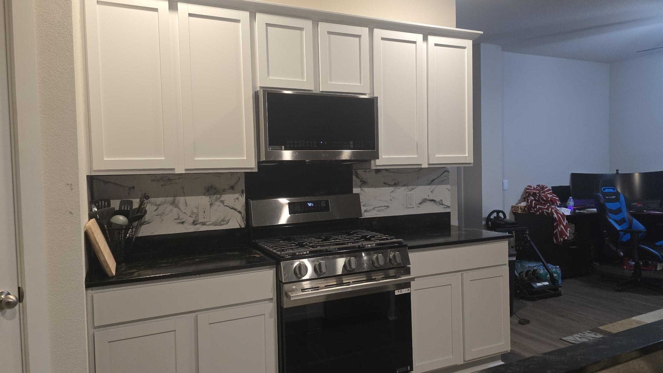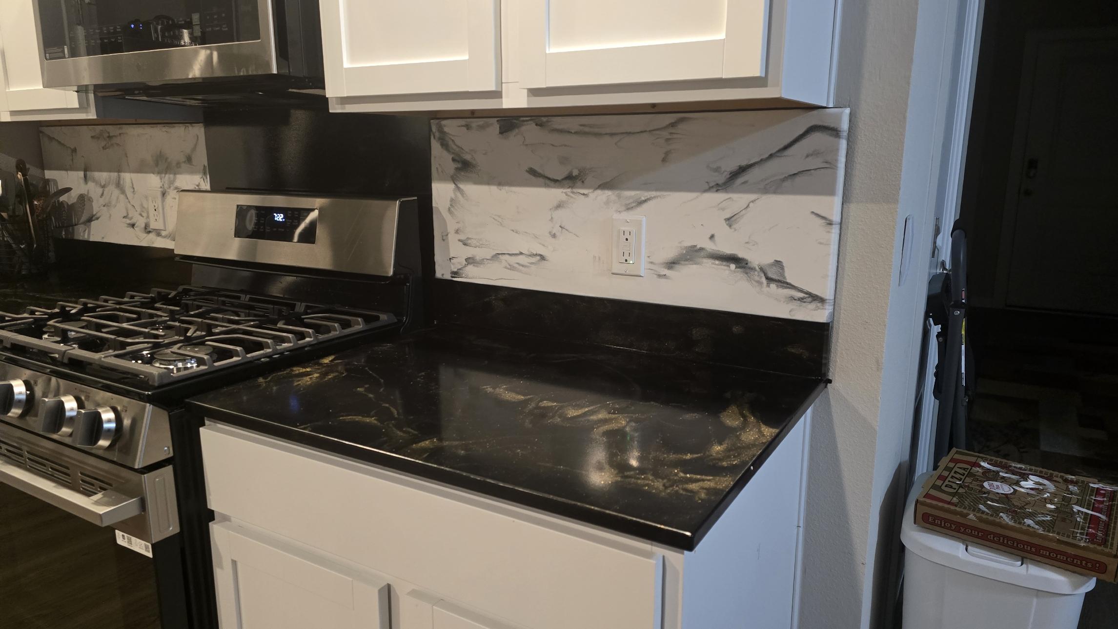 Countertops (Black w/gold accents) and Backsplash (Black & Gold bottom with white & black top)