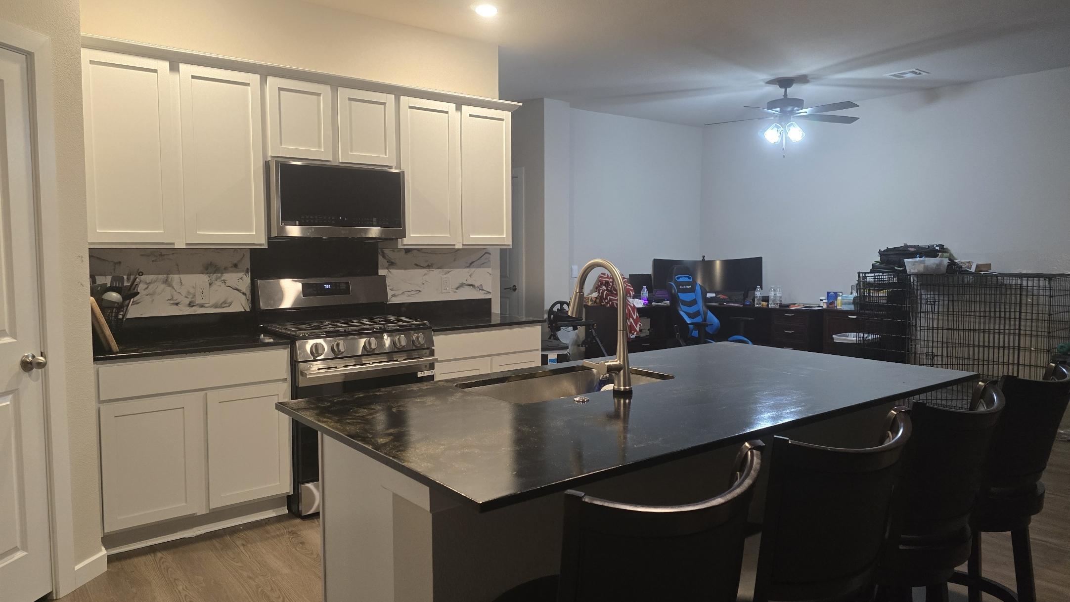 Countertops (Black w/gold accents) and Backsplash (Black & Gold bottom with white & black top)